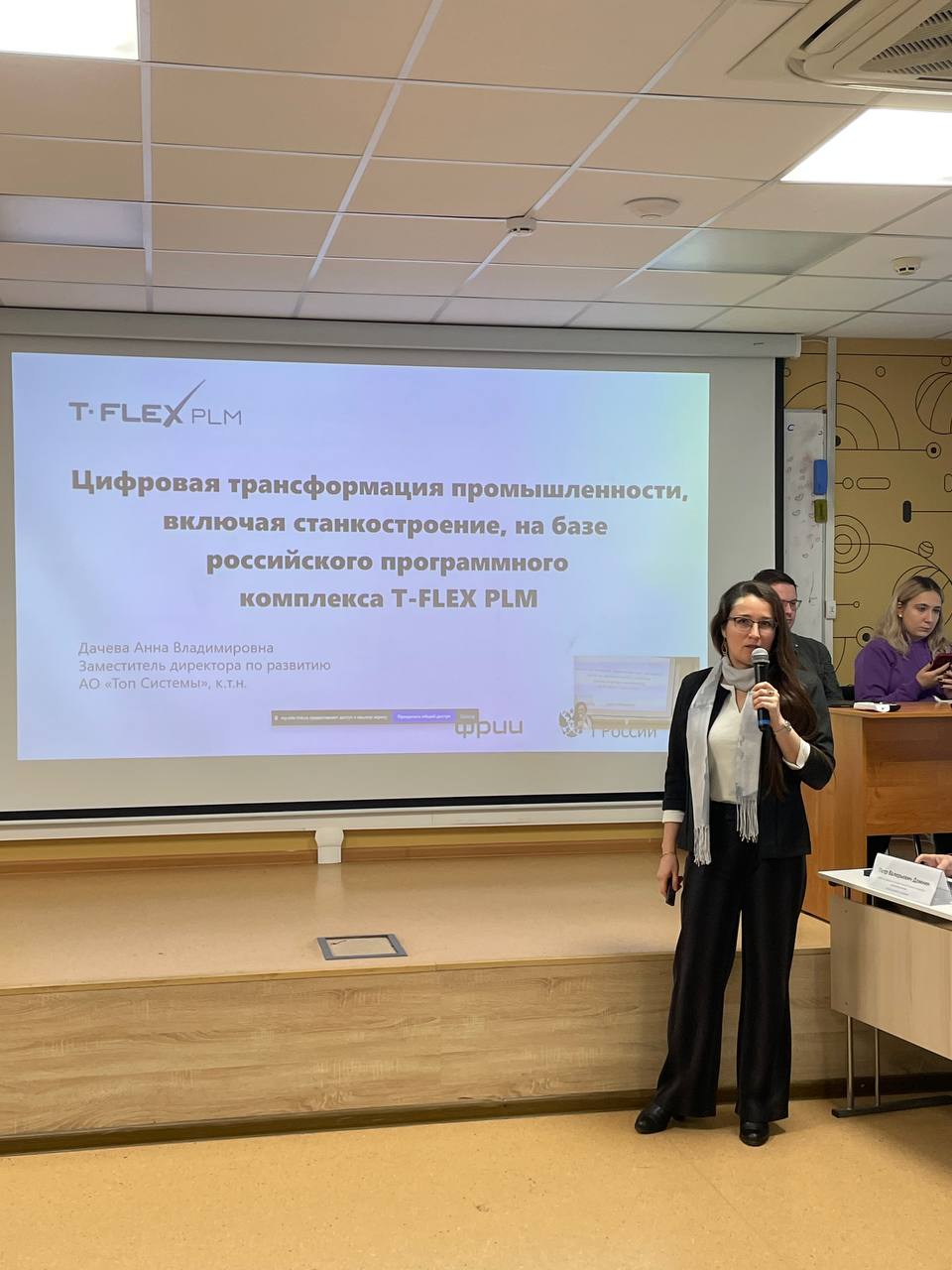 Заместитель директора по развитию АО «Топ Системы» Анна Дачева подчеркнула, что на предприятии работает много выпускников СТАНКИНа, поскольку в нашем университете студенты приобретают навыки по работе с программным комплексом T-FLEX PLM, используемый в Роскосмосе, АЗ «Урал», ООО «СТАН». Спикер отметила, что интеграция разработок предприятий в образовательный процесс вузов позволяет сократить кадровый дефицит.