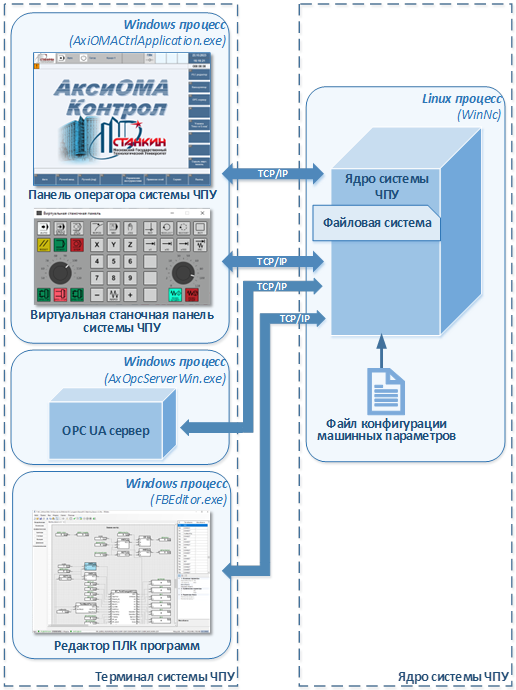 Система ЧПУ «АксиОМА Контрол» построена согласно клиент-серверной архитектуре, которая состоит из: ядра и терминальной части. Терминальная часть содержит панель оператора, виртуальную станочную панель, редактор ПЛК программ (опция) и OPC UA сервер (опция).